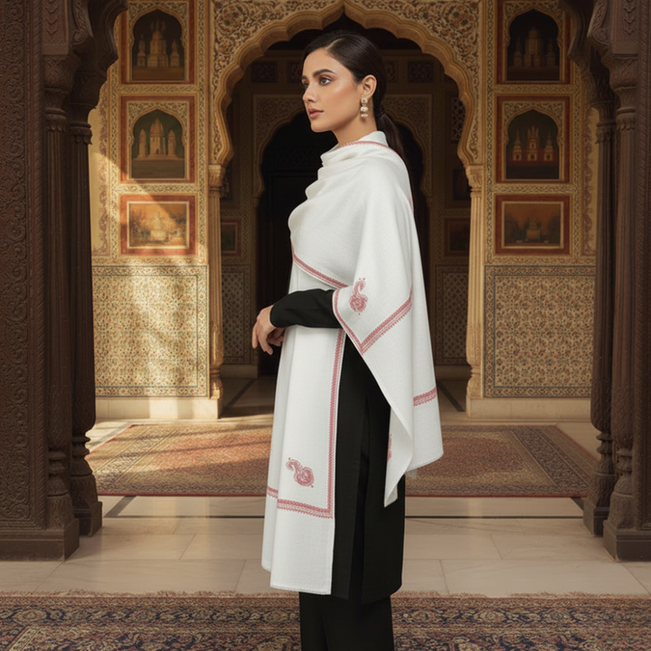 Woven from the choicest fine wool, this stole caresses your skin with luxurious softness, ensuring a cocoon of comfort wherever you go. The Kashmiri Hand Embroidery, featuring the iconic Kingri Design