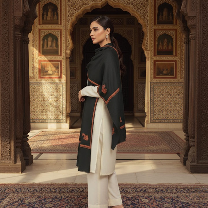 Effortless Elegance: For a day out in the city, casually wrap this stole around your neck. The subdued elegance of Black, coupled with the fine wool and intricate embroidery, brings forth an effortless and sophisticated charm.