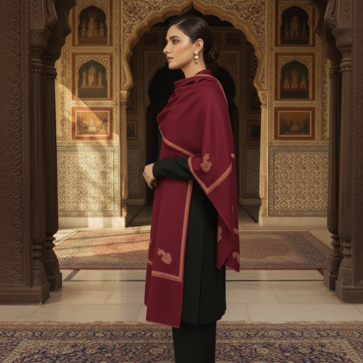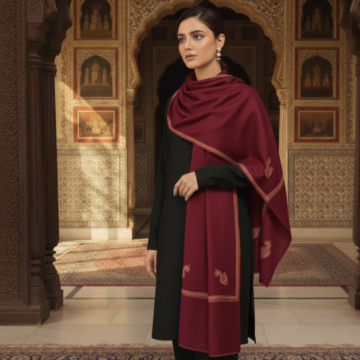 Woven from the choicest fine wool, this stole caresses your skin with luxurious softness, ensuring a cocoon of comfort wherever you go. The Kashmiri Hand Embroidery, featuring the iconic Kingri Design