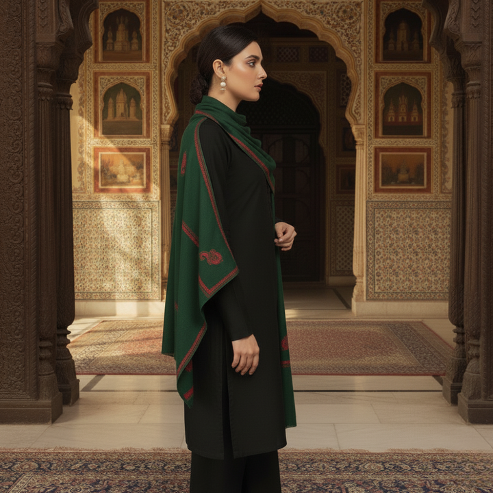 Effortless Elegance: For a day out in the city, casually wrap this stole around your neck. The subdued elegance of Black, coupled with the fine wool and intricate embroidery, brings forth an effortless and sophisticated charm.
