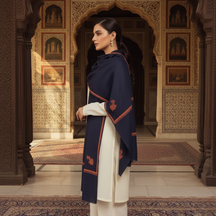 Embroidered Kingri Woolen Stole - Navy