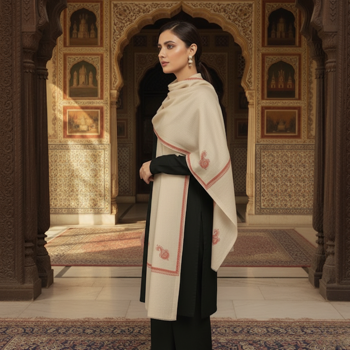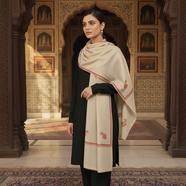 - Woolen Stole with Resham Embroidered on Border and Motif on Pallu
