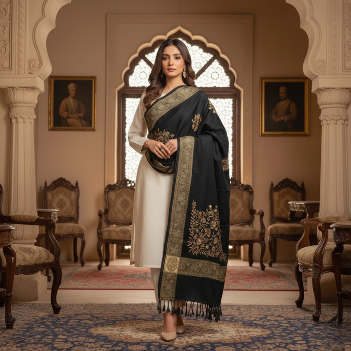 Design: Traditional Kashmiri embroidery with intricate paisley patterns along the border and delicate Tapestry in Between